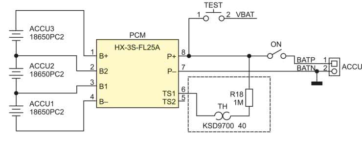 Niektóre wersje obsługują wejście zabezpieczenia termicznego pakietu, zaznaczone na schemacie przerywaną linią. Układ współpracuje z opcjonalnym termostatem, który po przekroczeniu temperatury 40°C odcina ogniwo.