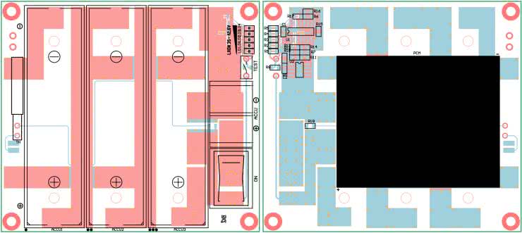 Następnie za pomocą dwustronnej taśmy klejącej montujemy układ PCM, wyprowadzenia układu lutujemy do płytki, wykorzystując odcinki taśmy niklowej lub srebrzanki. Przed wlutowaniem koszyków 18650, przykręcamy je do płytki za pomocą śrubek M2,5, zakładając podkładki izolacyjne pod nakrętki. W otwory mocujące płytki wkręcamy tulejki dystansowe, docelowo na spód płytki warto przyciąć osłonę z materiału izolacyjnego, aby nie dopuścić do przypadkowych zwarć podczas eksperymentów.
