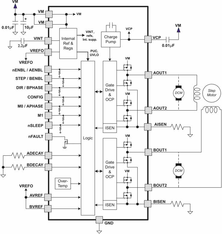 Układ DRV8834 pracuje przy napięciu zasilania z zakresu 2,5...10,8 V i dostarcza do uzwojeń silnika ciągły prąd o wartości do 1,5 A (w szczycie 2,2 A). Układ uzupełniono także o sygnalizację stanów awaryjnych, takich jak przegrzanie, przeciążenie, zwarcie i blokadę podnapięciową, sygnalizowane na wyjściu nFAULT. Schemat wewnętrzny sterownika DRV8834 został pokazany na rysunku 1.