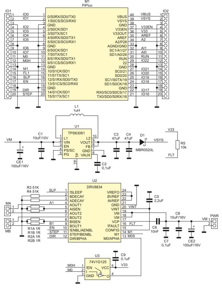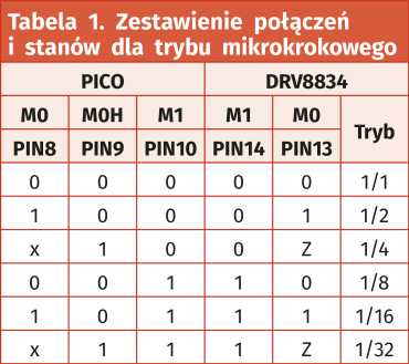 Wszystkie sygnały sterujące pracą U2 doprowadzone są do GPIO Pi Pico. Umożliwia to pełne programowe sterowanie pracą drivera. DRV8834 poprzez wyprowadzenie CONFIG ustawiony jest w tryb pracy z wbudowanym sekwencerem, z możliwością pracy mikrokrokowej. Sterowanie w tym trybie odbywa się w standardzie EN/DIR/STEP, gdzie procesor, sterujący po aktywowaniu drivera sygnałem EN, generuje tylko sygnał kierunku DIR i impuls narastający kroku STEP, co znacząco ułatwia sterowanie silnikiem. Sygnał EN=0 załącza sterownik, sygnał SLP=0 wprowadza U2 w tryb obniżonego poboru mocy. Wejścia M0, M1 umożliwiają zmianę aktualnego mikrokroku. Bramka U3 umożliwia ustawienie stanu wysokiej impedancji niezbędnego przy sterowaniu wyprowadzeniem M0. Stany logiczne wyprowadzeń M0, M0H, M1 wybierające sterowanie mikrokrokowe przedstawiono w tabeli 1.