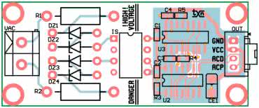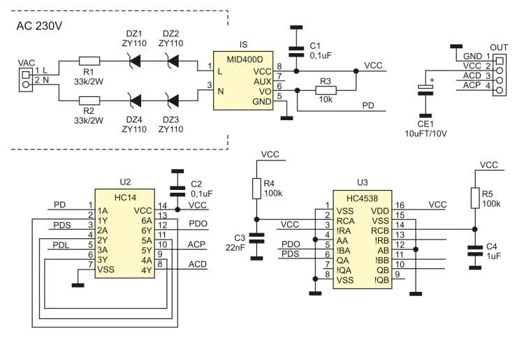 Sygnał wyjściowy PD z wyprowadzenia Vo MID400 doprowadzony jest do bramki buforowej układu HC14, a z niej na wejścia multiwibratorów monostabilnych układu HC4538 (sygnał PDO). Multiwibrator U3-A generuje impulsy dodatnie o czasie ok. 2,5 ms, po każdej detekcji zera napięcia sieciowego, gdy napięcie sieciowe przekracza próg ULVO (sygnał wyjściowy PDS/ACP). Drugi multiwibrator zmienia swój stan na wysoki, jeżeli napięcie wejściowe przekracza ULVO (sygnał wyjściowy PDL/ACD). Sygnały z multiwibratorów są buforowane i doprowadzone do złącza OUT.
