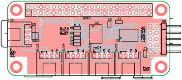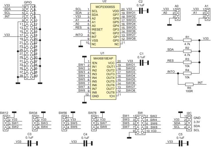 Wolne od zakłóceń sygnały SWO1...8 podłączone są do ekspandera GPIO magistrali I²C. Dla uproszczenia obwodu drukowanego odwrócono podłączenia styków SW1...8 z układem U2. MCP23008 ma możliwość generowania przerwania po zmianie stanu wejścia, po wlutowaniu rezystora R5, przerwanie doprowadzone jest do GPIO4 Raspberry.