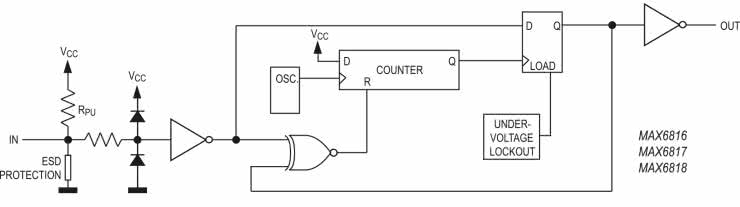 Moduł bazuje na układzie MAX6818, którego budowę wewnętrzną jednego z ośmiu kanałów pokazano na rysunku 1. Wejście zawiera elementy zabezpieczające, a dzięki zastosowanej logice wyjście aktywowanie jest po ustabilizowaniu się stanu wejścia na czas dłuższy niż 40 ms.