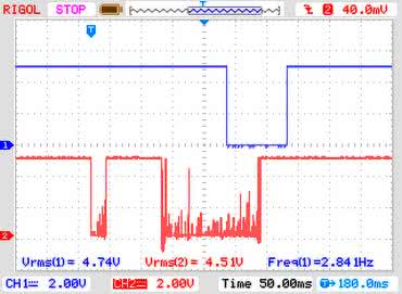 Przykładowy oscylogram pokazujący skuteczność układu został pokazany na rysunku 4, (2-IN, 1-OUT).