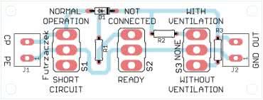 Układ został zmontowany na jednostronnej płytce drukowanej o wymiarach 80×30 mm. Jej schemat został pokazany na rysunku 2. W odległości 3 mm od krawędzi płytki znalazły się cztery otwory montażowe, każdy o średnicy 3,2 mm.