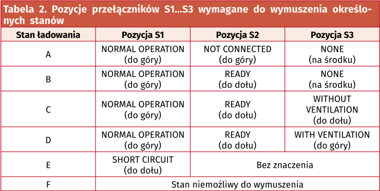 Przełącznikami S1…S3 można emulować różne stany ładowania samochodu elektrycznego. Zostały one zebrane w tabeli 2.