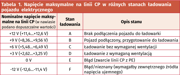 W tabeli 1 opisano stany ładowania samochodu elektrycznego oraz wartość maksymalną napięcia na linii CP. Łatwo można policzyć, że te wartości napięcia są możliwe do uzyskania na linii CP (mierzone na złączu J1, nie J2!), jeżeli w obliczeniach dotyczących dzielnika rezystorowego uwzględni się spadek napięcia na diodzie D1. Ulega ona zatkaniu przy napięciu chwilowym niższym od zera, więc ujemne części sygnału PWM nie będą dzielone - wartość minimalna sygnału zawsze powinna wynosić około -12 V.