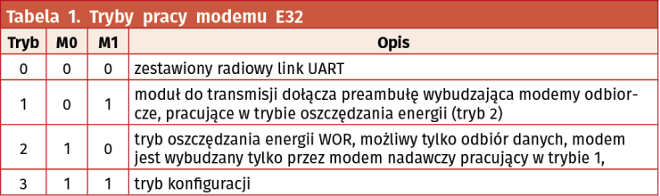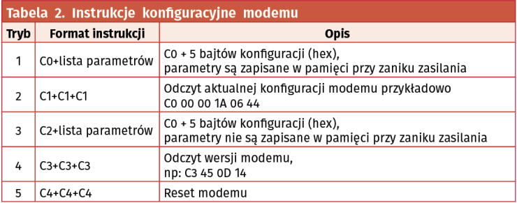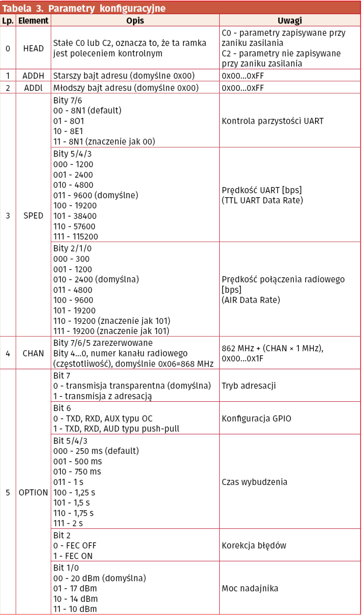 Modem można oczywiście konfigurować bez użycia oprogramowania. W dalszym ciągu musi pozostawać w trybie konfiguracji M0, M1 = 1, z parametrami portu szeregowego 9600,8,N,1. Obsługiwane są instrukcje konfiguracyjne, zestawione w tabeli 2. Znaczenie poszczególnych parametrów konfiguracyjnych zestawiono w tabeli 3.