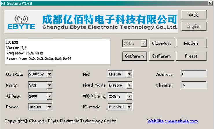 Jeżeli modemy działają na konfiguracji fabrycznej, można przejść do pobrania i instalacji oprogramowania konfiguracyjnego RF_Setting.exe (aktualna wersja w momencie pisania artykułu to v3.49) ze strony www.Ebyte.com. Przed uruchomieniem oprogramowania, należy zdjąć zwory M0, M1 wprowadzając modem w tryb konfiguracji. Po otwarciu portu szeregowego, do którego podłączony jest modem, pobieramy parametry ustawione fabrycznie GetParam, co pokazano na rysunku 3.