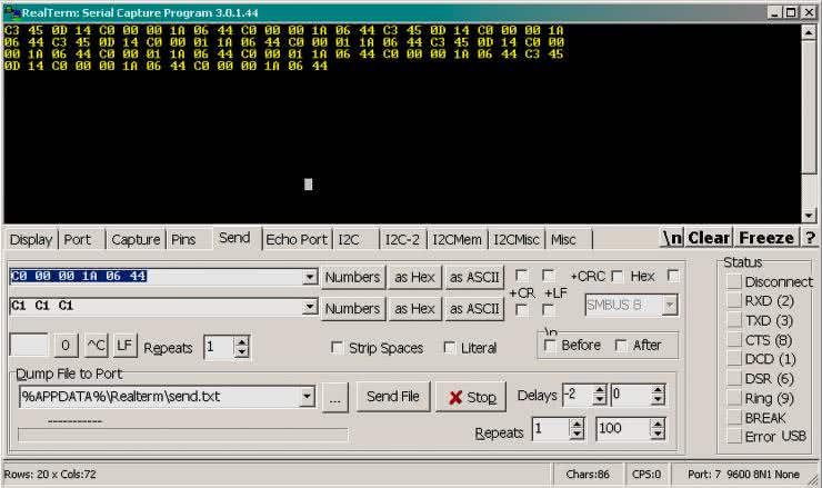 Konfiguracji modemu można w celach testowych dokonać po zmianie programu terminala na Realterm lub inny, który umożliwia wysłanie sekwencji kontrolnej (hex). Przykładową komunikację podczas konfiguracji modemu pokazano na rysunku 4. W identyczny sposób modem jest konfigurowany podczas współpracy z mikroprocesorem.
