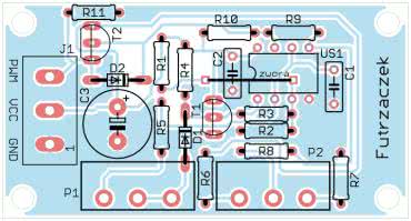 Układ został zmontowany na jednostronnej płytce drukowanej o wymiarach 60×32 mm. Jej schemat został pokazany na rysunku 2.