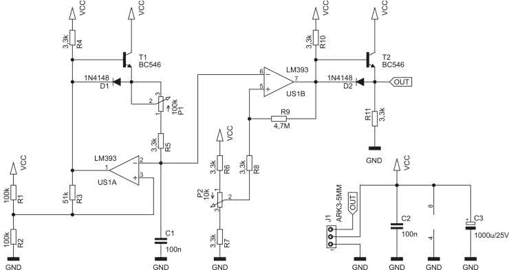 Schemat ideowy omawianego układu znajduje się na rysunku 1. Najistotniejszym elementem aktywnym bez wątpienia jest podwójny komparator typu LM393. US1A został skonfigurowany do pracy jako generator sygnału prostokątnego, lecz przekazywany dalej sygnał pochodzi z okładek kondensatora C1 - ma on kształt quasi-trójkątny. Za tempo przeładowywania C1 odpowiada wypadkowa rezystancja szeregowego połączenia elementów R5 i P1. Im niższa, tym szybciej się ono odbywa.