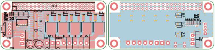 Moduł wyposażony jest w przetwornice PSU obniżającą napięcie zasilania taśm 12 V do 5 V wymaganego przez Pi Zero, co upraszcza aplikację do jednego zasilacza 12 V podłączonego do złącza PWR. W przypadku współpracy z kilkoma nakładkami przetwornice montujemy tylko w jednej z nich.