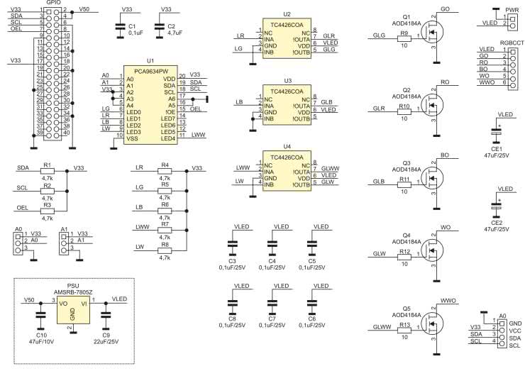 Sygnały wyjściowe LR/LG/LB/LW/LWW są buforowane układami sterowników bramek tranzystorów MOSFET U2...4 typu TC4426. Tranzystory wykonawcze Q1...5 sterują poszczególnymi łańcuchami kolorów taśmy. Moduł wyposażony jest w złącze I²C zgodne ze standardem Grove. Sygnał OEL pozwala na sprzętowe globalne załączenie/wyłączenie taśmy bez modyfikacji rejestrów sterujących U1.