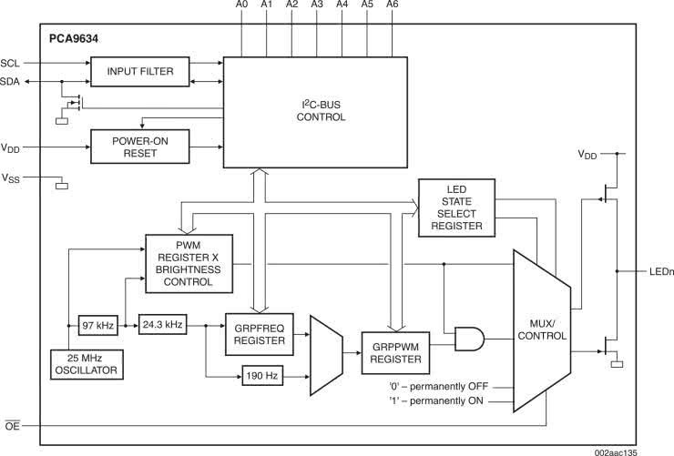 Moduł jest aplikacją układu PCA9634 (U1), którego strukturę wewnętrzną pokazano na rysunku 1. PCA9634 wchodzi w skład rodziny kontrolerów LED I²C firmy NXP. Jest to konfigurowany ośmiokanałowy generator PWM z możliwością indywidualnej i grupowej regulacji PWM.