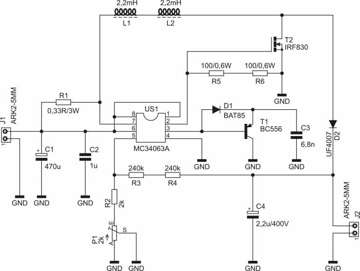 Napięcie wejściowe, które ma zostać podniesione, podaje się na zaciski złącza J1. Powinno być wyprostowane, a najlepiej gdyby było dobrze filtrowane, choć niekoniecznie stabilizowane. Kondensatory C1 i C2 zmniejszają impedancję wewnętrzną takiego źródła w szerokim zakresie częstotliwości, ponieważ przetwornica impulsowa pobiera prąd… właśnie, impulsami - na dodatek, o krótkim czasie przełączania.