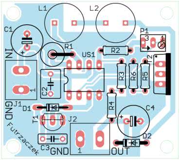 Układ został zmontowany na jednostronnej płytce drukowanej o wymiarach 45×40 mm, której schemat jest pokazany na rysunku 2. W odległości 3 mm od krawędzi płytki znalazły się cztery otwory montażowe, każdy o średnicy 3,2 mm.