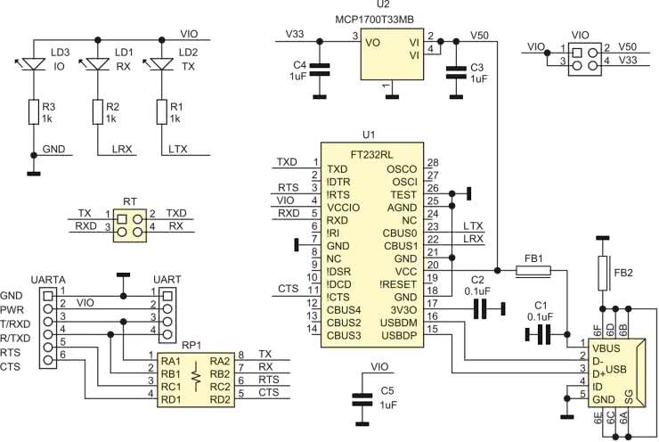 Schemat modułu konwertera pokazano na rysunku 1. Moduł zawiera tylko dwa układy scalone: konwerter USB-UART (U1) typu FT232RL oraz stabilizator LDO (U2) typu MCP1700 3,3 V.
