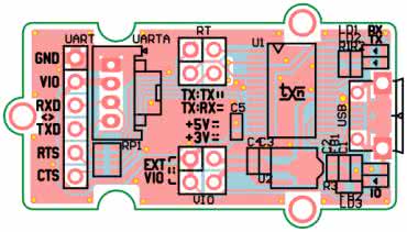 Układ FT232RL ma wbudowany konwerter poziomów logicznych 1,8...5 V. Aby możliwa była praca w pełnym zakresie akceptowanych napięć IO, należy zdjąć zworę VIO (lub założyć ją na wyprowadzenia 1-3), rozłączając wbudowane źródła zasilania. Napięcie VIO musi zostać doprowadzone z układu współpracującego. Umożliwia to także współpracę z układami logicznymi 1,8 V lub 2,5 V.