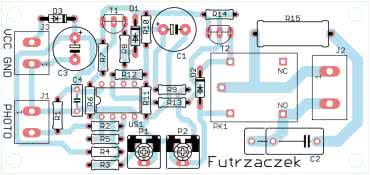 Układ został zmontowany na jednostronnej płytce drukowanej o wymiarach 85×40 mm, której schemat został pokazany na rysunku 2. W odległości 3 mm od krawędzi płytki znalazły się cztery otwory montażowe, każdy o średnicy 3,2 mm. Montaż proponuję rozpocząć od elementów o najmniejszej wysokości obudowy, czyli rezystorów małej mocy i diod półprzewodnikowych. Pod układ scalony US1 proponuję zastosować podstawkę, aby ułatwić jego wymianę w razie ewentualnego uszkodzenia. W pełni zmontowany układ można zobaczyć na fotografii 1. Fotorezystor należy podłączyć do zacisków złącza J1, co również jest widoczne.