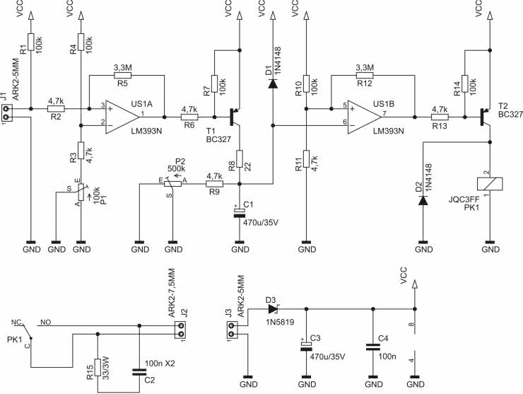 Schemat ideowy omawianego układu znajduje się na rysunku 1. Najistotniejszym elementem aktywnym jest bez wątpienia podwójny komparator typu LM393. US1A jest odpowiedzialny za detekcję wystarczająco wysokiego natężenia oświetlenia. Komparator ten porównuje dwa potencjały. Jednym z nich jest napięcie odkładające się na zaciskach fotorezystora podłączonego do złącza J1. Prąd płynący przez ten fotorezystor ogranicza rezystor R1, tworząc tym samym dzielnik napięcia zasilającego. Drugim potencjałem również jest wyjście dzielnika napięcia, tym razem składającego się z rezystorów R3 i R4 oraz rezystancji potencjometru P1. Komparator przełączy się, kiedy rezystancja fotorezystora będzie mniejsza lub większa od tej, którą daje wypadkowa rezystancja R3 i P1, ponieważ R1 i R4 mają tę samą rezystancję, a dokładniej: wyjście komparatora znajdzie się w niskim stanie logicznym, kiedy rezystancja fotorezystora zmaleje poniżej granicy wyznaczonej przez R3 i P1.