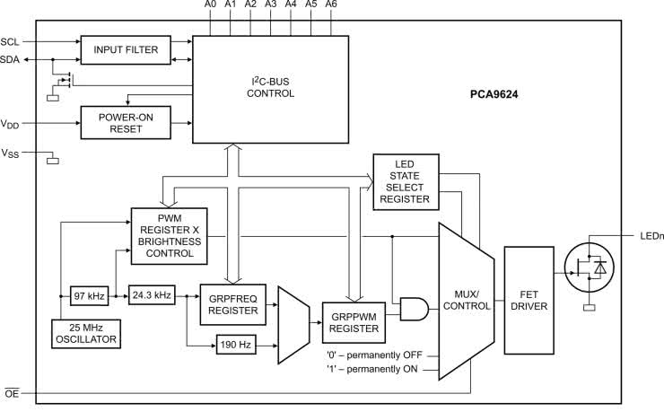 Każde z wyjść może być ustawione w stan GND/VCC. Wewnętrzny oscylator i programowane dzielniki upraszczają aplikację układu. Wejście sprzętowe !OE umożliwia sterowanie buforem wyjściowym. Układ funkcjonuje poprawnie w zakresie zasilania 2,3...5,5 V. Programowo jest zgodny z PCA9634, z wyjątkiem możliwości sterowania typem OUTDRV i negacją wyjść INVRT.