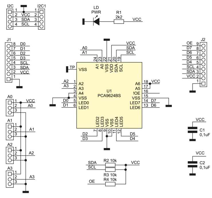 Schemat układu pokazano na rysunku 5. Nie jest on skomplikowany – zawiera zaledwie kilka elementów i zestaw szpilek goldpin oraz złączy udostępniających wszystkie istotne wyprowadzenia układu PCA9624.