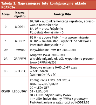 Odczyt odbywa się podobnie. Dokładniejsze informacje oczywiście zamieszczone są w nocie katalogowej. Najważniejsze bity konfiguracyjne dla podstawowego trybu pracy pokazano w tabeli 2.