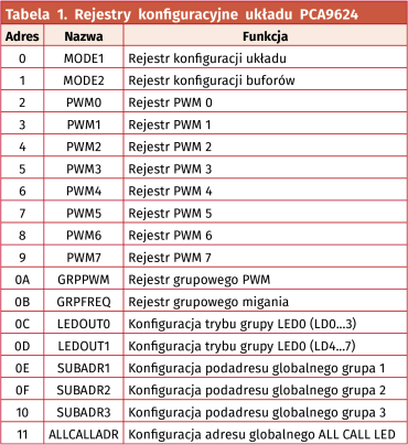 Sercem modułu jest układ PCA9624, którego strukturę wewnętrzną pokazano na rysunku 1. Wchodzi w skład szerokiej rodziny kontrolerów LED firmy NXP. Jest sterowany i konfigurowany przez interfejs I²C i ma możliwość zewnętrznego ustawiania adresu za pomocą wyprowadzeń A0...A6, co daje 126 adresów I²C. Kilka adresów magistrali jest zarezerwowanych dla sterowania globalnego. Adres 0x03 zarezerwowany jest dla resetu globalnego, adres 0x70 domyślnie dla globalnego sterowania wszystkimi LED. Ułatwia to oprogramowanie układów wyświetlaczy składających się z kaskady PCA9624, gdyż wszystkie układy, niezależnie od adresu fizycznego, reagują na jedną komendę globalną, co znacząco odciąża magistralę I²C od zbędnych transmisji. Możliwe jest także definiowanie podadresów grupujących sterowane diody LED i ułatwiających tworzenie ekranów RGB.