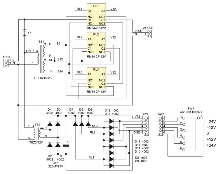 Uzwojenie wtórne 2×12 V łączone jest w szereg z uzwojeniem pierwotnym TS1. Zespól trzech przekaźników RL1...RL3 odpowiada za zmianę odczepów 0-12-24 V oraz odwrócenie fazy napięcia uzwojenia wtórnego, co umożliwia odejmowanie i dodawanie napięcia wtórnego do napięcia sieci. Wybrane napięcia doprowadzone jest do zacisków ACOUT. Wybór transformatora z napięciem 2×12 V umożliwia realizację przybliżonej tolerancji +5/10% napięcia zasilania, co po odpowiednim przełączaniu pozwala otrzymać 0%, ±5% i ±10% napięcia sieciowego.
