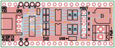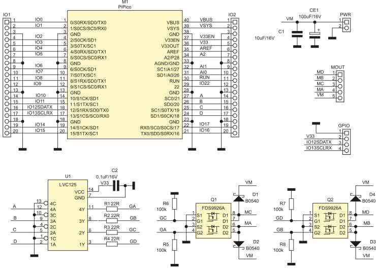 Układ U1 typu LVC125 zapewnia separację portów GPIO procesora i wysterowanie bramek tranzystorów wykonawczych. Zasilanie części logicznej pobierane jest z wbudowanej przetwornicy 3,3 V Pi Pico. Sterowanie silnikiem zajmuje cztery wyprowadzenia GPIO18...21. Układ uzupełnia złącze GPIO dla wyprowadzeń 12, 13 lub magistrali I²C w standardzie Grove, ułatwiające podłączenie zewnętrznych czujników w standardzie 3,3 V.