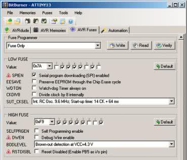 Na etapie uruchamiania jest konieczne zaprogramowanie pamięci Flash mikrokontrolera dostarczonym wsadem oraz zmiana jego bitów zabezpieczających. Oto ich nowe wartości: Low Fuse = 0x7A, High Fuse = 0xF9. Szczegóły są widoczne na rysunku 3, który pokazuje wygląd okna konfiguracji tych bitów w programu BitBurner. W ten sposób zostanie wyłączony dzielnik częstotliwości wbudowanego generatora sygnału zegarowego oraz załączy się Brown-Out Detector, który wprowadzi mikrokontroler w stan zerowania, jeżeli jego napięcie zasilające spadnie poniżej 4,3 V. To znacznie zmniejsza ryzyko zawieszenia się układu podczas uruchamiania.