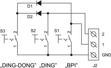 Układ ma dwa zaciski wyzwalające, lecz może z siebie wydobyć trzy różne dźwięki. Trzeci dźwięk („ding-dong”) jest generowany po jednoczesnym zwarciu zacisków oznaczonych jako 1 i 2 do masy. Jeżeli chcemy korzystać tylko z tego dźwięku, trzeba te dwa wejścia zewrzeć ze sobą i dołączać do GND w chwili, gdy chcemy, by układ zadziałał. Propozycję podłączenia trzech przycisków, z których każdy dawałby inny dźwięk, zawiera rysunek 4. Jako D1 i D2 można zastosować dowolne diody półprzewodnikowe, na przykład 1N4007 lub 1N4148. Dzięki nim będzie możliwe oddzielne sterowanie wejściami 1 oraz 2, jak również ich jednoczesna aktywacja. Schemat z rysunku 4 można zredukować do jednego lub dwóch przełączników, w zależności od potrzeb.