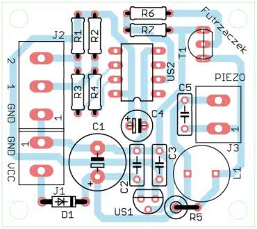 Układ został zmontowany na jednostronnej płytce drukowanej o wymiarach 45×40 mm. Jej wzór ścieżek oraz schemat montażowy został pokazany na rysunku 2. W odległości 3 mm od krawędzi płytki znalazły się cztery otwory montażowe, każdy o średnicy 3,2 mm.