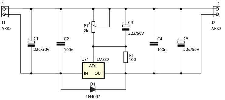 Napięcie wyjściowe ustala dzielnik rezystancyjny, na który składają się dwa elementy: rezystor R1 i potencjometr P1. R1 wymusza prąd wyjściowy stabilizatora na poziomie 12,5 mA – to nieco więcej, niż nakazuje nota katalogowa (typowo 10 mA), lecz moje doświadczenia wskazują, że niektóre egzemplarze LM337 potrafią się wzbudzić po użyciu zalecanej rezystancji R1 (120 Ω) w tego typu układzie. Pobór prądu większy o 2,5 mA nie będzie w tym układzie stanowił istotnego problemu, w zamian za to mamy gwarancję stabilnej pracy. Kondensator C3 poprawia tłumienie tętnień. Rolą diody D1 jest zabezpieczenie układu US1 w sytuacji, kiedy napięcie wejściowe by nagle zanikło, a wyjściowe byłoby nadal utrzymywane, na przykład przez dodatkowy kondensator o wysokiej pojemności.