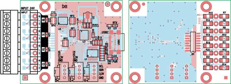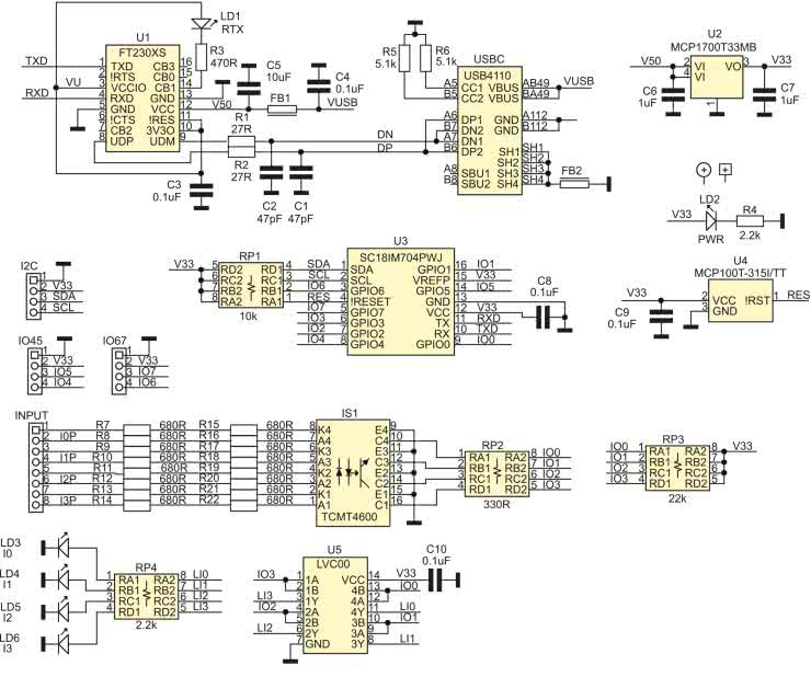 Układ U3 typu SC18IM704 pełni funkcję mostka UART/GPIO/I²C, za poprawny restart po włączeniu zasilania odpowiada U4 typu MCP100T-315. Mostek U3 ma 8 wyprowadzeń GPIO, w modelu cztery z nich GPIO3...0 służą do monitorowania stanów optoizolowanych wejść IO3...0. Sygnały wejściowe w standardzie 24 VDC doprowadzone są do złącza INPUT. Poczwórny transoptor IS1 typu TCMT4600 separuje je od części logicznej modułu. Za sygnalizację stanów wejść IN1...4 odpowiadają diody LD3...LD6 buforowane przez bramki U5. Pozostałe cztery GPIO układu SC18IM704 wraz z zasilaniem 3,3 V doprowadzone są do złączy zgodnych z Grove IO45, IO67, do których można bezpośrednio podłączyć czujniki lub sygnalizatory systemu Grove zgodne z 3,3 V.