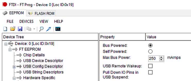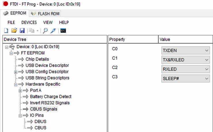 Poprawnie zmontowany układ nie wymaga uruchamiania. Po podłączeniu do portu USB, konwerter FT230 powinien zostać wykryty i automatycznie zostaną zainstalowane sterowniki. Przy użyciu oprogramowania narzędziowego FT Prog należy skonfigurować prąd pobierany z magistrali zgodnie z rysunkiem 4. Następnie należy zmienić konfigurację wyprowadzenia C1 na sygnalizację sumy sygnałów RXD/TXD zgodnie z rysunkiem 5. Jeżeli konfiguracja została ustalona i zapisana, należy układ zrestartować poprzez odłączenie i ponowne podłączenie do magistrali USB.