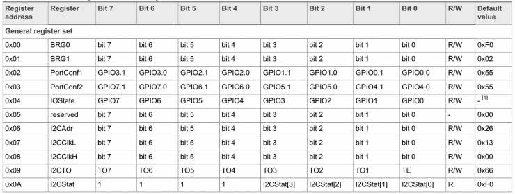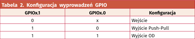 Przed użyciem wyprowadzeń GPIO w rejestrach PortConf1/2 należy ustawić wymaganą konfigurację wyprowadzenia, zgodnie z tabelą 2.