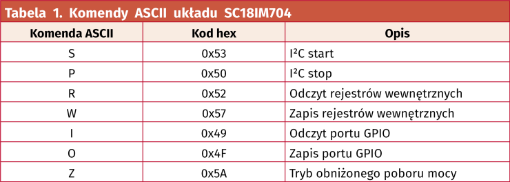 Dla sprawdzenia modułu należy zainstalować terminal portu szeregowego z możliwością wysyłania sekwencji znaków np. Realterm oraz źródło sygnału 24 V i kilka czujników Grove 3,3 V. Komunikacja z układem SC18IM704 odbywa się poprzez wysłanie polecenia w postaci komendy ASCII, zestaw rozpoznawanych komend został pokazany w tabeli 1. Komendy nierozpoznane są ignorowane. Układ ma wbudowany licznik time-out, który kasuje zawartość buforów, jeżeli odbiór kolejnych dwóch znaków zajmuje więcej niż 655 ms.