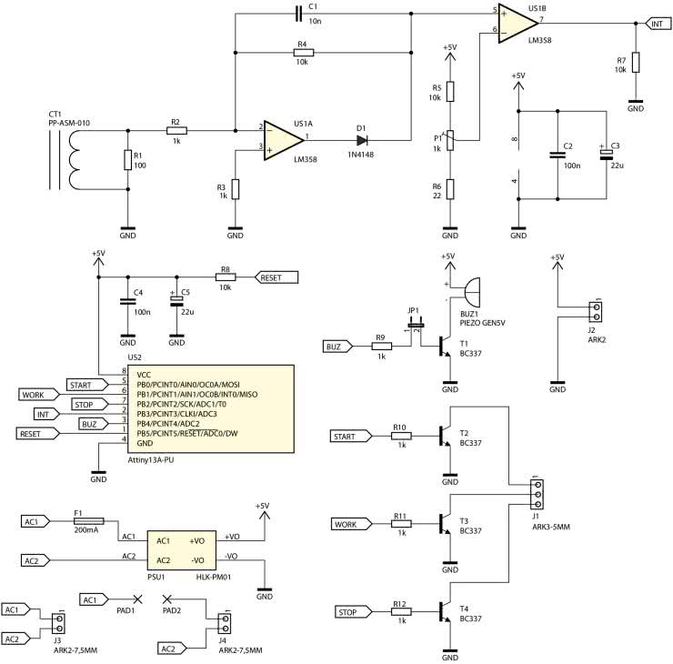 Schemat ideowy omawianego układu znajduje się na rysunku 1. Napięcie sieciowe (z sieci elektroenergetycznej 230 V lub 115 V – bez znaczenia) należy podłączyć do zacisków złącza J3. Prąd płynący przez zaciski tego złącza dociera zarówno do nadzorowanego odbiornika, który należy podłączyć do zacisków złącza J4, jak i do przetwornicy impulsowej PSU1, która daje na swoim wyjściu stabilizowane napięcie stałe o wartości 5 V. Wejście przetwornicy zostało zabezpieczone bezpiecznikiem kubkowym F1, który ma odciąć jej zasilanie w przypadku znaczącego wzrostu poboru prądu – na przykład, wskutek wystąpienia w jej strukturze uszkodzenia.