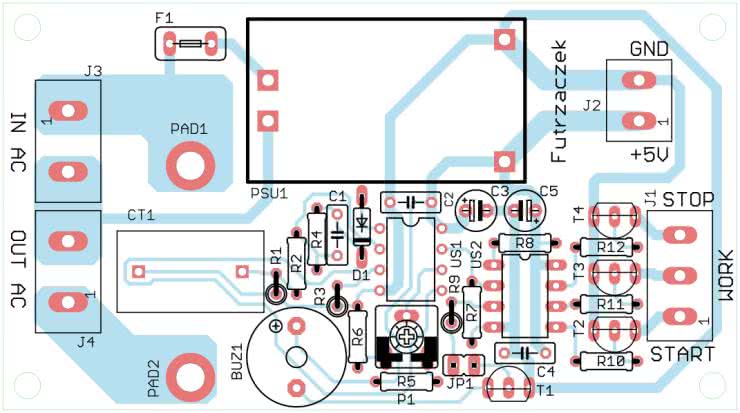 Montaż proponuję rozpocząć od elementów o najmniejszej wysokości obudowy, czyli rezystorów i diod. Pod układy US1 i US2 warto zastosować podstawki, aby ułatwić ich wymianę w razie uszkodzenia oraz programowanie mikrokontrolera. Na samym końcu trzeba wlutować przekładnik CT1, uprzednio przekładając przez otwór w jego rdzeniu przewód o przekroju 2,5 mm² z odizolowanymi i pobielonymi końcówkami. Ścieżki łączące zaciski złącz J3 i J4 oraz pola lutownicze przy przekładniku zostały odsłonięte spod maski lutowniczej, by możliwe było ich pogrubienie warstwą zwykłego spoiwa lutowniczego.