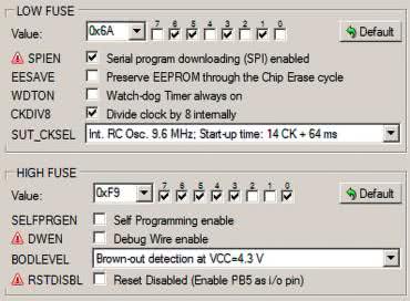 Szczegóły są widoczne na rysunku 3, który zawiera widok okna konfiguracji bitów z programu BitBurner. W ten sposób zostanie uruchomiony Brown-Out Detector, który wprowadzi mikrokontroler w stan zerowania, jeżeli jego napięcie zasilające spadnie poniżej 4,3 V. To znacznie zmniejsza ryzyko zawieszenia się układu podczas uruchamiania oraz przy krótkotrwałych zanikach napięcia sieciowego.