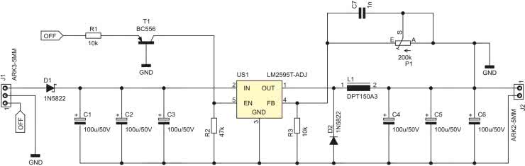 Potencjometr P1 wraz z rezystorem R3 tworzą dzielnik napięcia wyjściowego. Ich zadaniem jest zamknięcie pętli ujemnego sprzężenia zwrotnego, aby napięcie wyjściowe mogło zawsze znajdować się na tym samym poziomie, ustalonym uprzednio przez potencjometr P1. Maksimum napięcia wyjściowego, które da się w tym układzie ustawić, to –1,23 V – tyle wynosi napięcie referencyjne układu LM2595. Z kolei minimum, jakie wynika z dzielnika R3+P1, to około –26 V. Kondensator C7 przyspiesza działanie pętli ujemnego sprzężenia zwrotnego dla wysokich częstotliwości, poprawiając stabilność pracy przetwornicy.