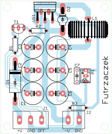 Układ został zmontowany na niewielkiej, jednostronnej płytce drukowanej o wymiarach 50 ×60 mm. Jej schemat został pokazany na rysunku 2. W odległości 3 mm od krawędzi płytki znalazły się cztery otwory montażowe, każdy o średnicy 3,2 mm.