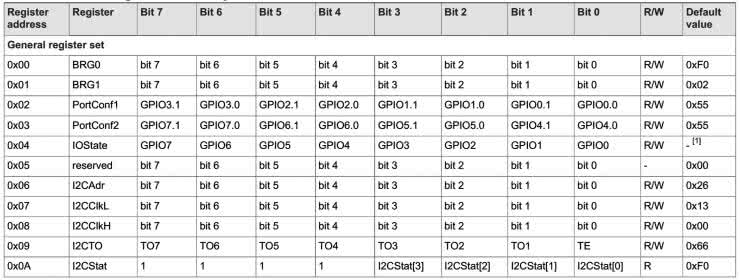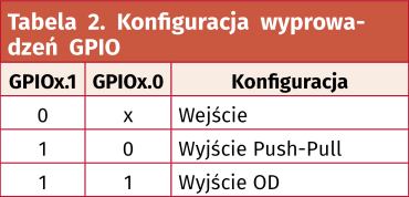 Przed użyciem wyprowadzeń GPIO w rejestrach PortConf1/2 należy ustawić wymaganą konfigurację wyprowadzenia, zgodnie z tabelą 2.