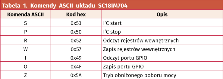Dla sprawdzenia modułu należy zainstalować terminal portu szeregowego z możliwością wysyłania sekwencji znaków np. Realterm. Komunikacja z układem SC18IM704 odbywa się poprzez wysłanie polecenia w postaci komendy ASCII, zestaw rozpoznawanych komend zestawiono w tabeli 1. Komendy nierozpoznane są ignorowane. Układ ma wbudowany licznik time-out, który kasuje zawartość buforów, jeżeli odbiór kolejnych dwóch znaków zajmuje więcej niż 655 ms.