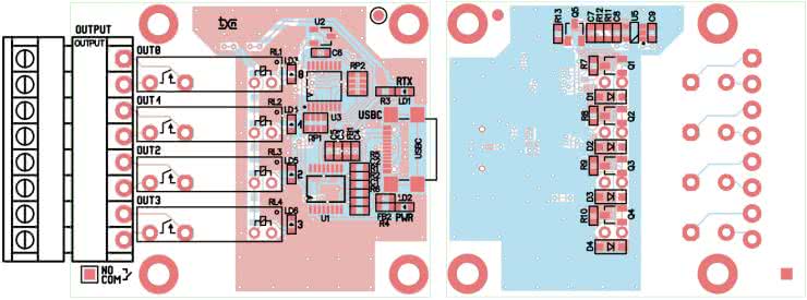 W module zastosowano nowoczesne przekaźniki Panasonic APAN3105 cechujące się niewielkimi rozmiarami oraz niewielkim poborem mocy (110 mW). Pozwala to na obniżenie całkowitego poboru mocy modułu do 0,5 W przy aktywnych wszystkich przekaźnikach. Cewki przekaźników buforowane są tranzystorami Q1...Q4, każda cewka ma sygnalizację podania napięcia zrealizowaną na diodach LD3...LD6. Styki przekaźników wyprowadzone są na złącze śrubowe OUTPUT.