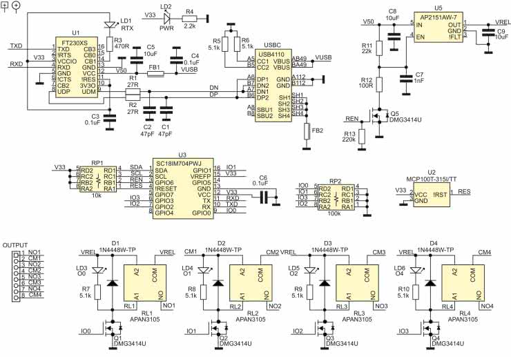Układ U1 typu FT230XS pełni funkcję interfejsu USB/UART, dioda LD2 sygnalizuje obecność zasilania, dioda LD1 aktywną transmisję szeregową (dla obu kierunków transmisji RX/TX). Wbudowany w U1 stabilizator 3,3 V jest używany do zasilania części logicznej układu. Układ U3 typu SC18IM704 pełni funkcję mostka UART/GPIO. Za poprawny restart po włączeniu zasilania odpowiada U2 typu MCP100T-315. Mostek U3 ma 8 wyprowadzeń GPIO. W modelu do sterowania cewkami przekaźników używane są GPIO0...3.