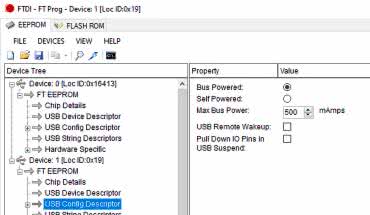 Po podłączeniu do portu USB, konwerter FT230 powinien zostać wykryty i powinno automatycznie zostać zainstalowane oprogramowanie. Przy użyciu oprogramowania narzędziowego FT Prog, należy skonfigurować prąd pobierany z magistrali – zgodnie z ustawieniami pokazanymi na rysunku 4.