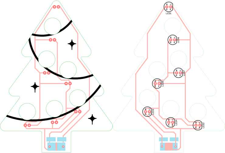 Schemat układu jest niezwykle prosty i został pokazany na rysunku 1. W zestawie znajdują się dwie płytki obwodu drukowanego: zielona jak drzewko iglaste (rysunek 2), które jest jednym z symboli grudniowych świąt i czarna, która jest elementem podstawy (rysunek 3). Na zielonej płytce montowane są diody LED. 6 z nich to diody imitujące światło świeczek, jakie niegdyś zdobiły choinki przed erą żarówkowych i LED-owych łańcuchów świetlnych. Dla dopełnienia jako czubek w zestawie znajduje się dioda LED w niebieskim kontrastującym kolorze. Diody LED należy zamontować wewnątrz specjalnie do tego celu przygotowanych otworów.
